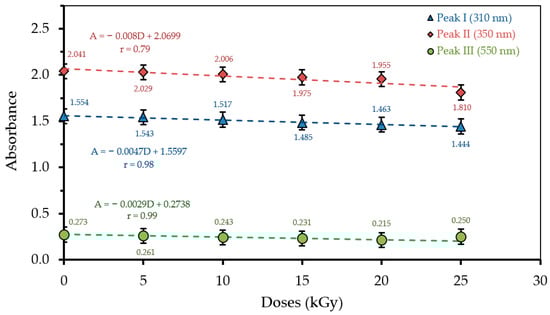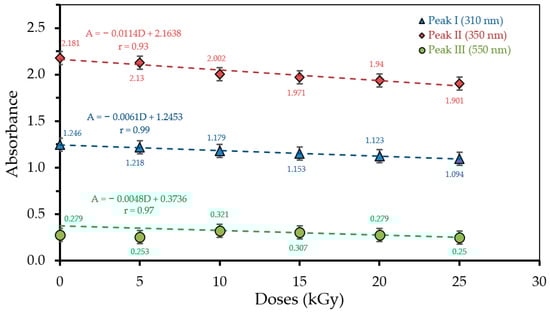 The relationship between radiation dose and absorbance for each absorption peak (310, 350, and 550 nm) for H3PO4 75 v% concentration is presented in Figure 4. It shows that for the H3PO4 85 v% concentration, the optical absorption values for all absorption peaks decrease with an increasing radiation dose with the relationship for each peak as follows: the first peak A = −0.0047D + 1.5597 (r = 0.98); second peak A = −0.008D + 2.0699 (r = 0.79); and third peak A = −0.0029D + 0.2738 (r = 0.99). The trend on the optical absorption for each peak for dosages of 0–25 kGy are 1.554 to 1.444 a.u for the first peak, 2.041 to 1.810 a.u for the second peak and 0.273 to 0.250 a.u for the third peak.