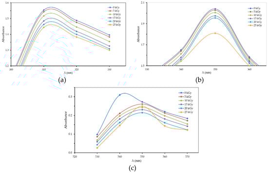 The relationship between absorbance (A) and wavelength (λ) for H3PO4 85 v% concentration for each radiation dose: (a) λ = 310 nm (peak I); (b) λ = 350 nm (peak II); (c) λ = 550 nm (peak III).