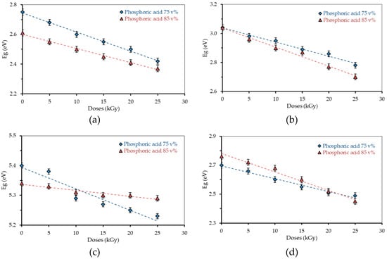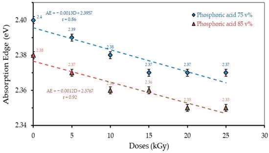 The relationship between the radiation dose and absorption edge for each concentration of H3PO4 are presented in Figure 5. The absorption edge of polymer film with a H3PO4 concentration of 75 v% of 2.4 eV (dose 0 kGy) decreases to 2.37 eV at a radiation dose of 25 kGy. Likewise, for the H3PO4 85 v%, the absorption edge decreases with an increasing radiation dose. The absorption edge shows the maximum energy absorbed by the polymer film PVA–H3PO4. It was found that the absorption edge value decreased with an increasing radiation dose and H3PO4 content in the polymer film. These results are relevant to previous studies, where the absorption edge decreased with an increasing radiation dose and CH composition in the PVA–CH polymer film [15]. The irradiated ion charge has a significant effect on the absorption edge shift in the UV–Vis spectrum as a result of the expanded conjugated system growth through the formation of radiation-induced intermolecular helical structures [44]. Several previous studies have shown that the absorption edge of the UV–Vis transmission spectrum in polymers shifts with an increasing influence of radiations [45,46,47,48].