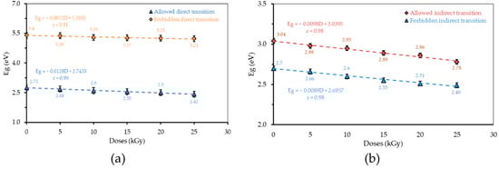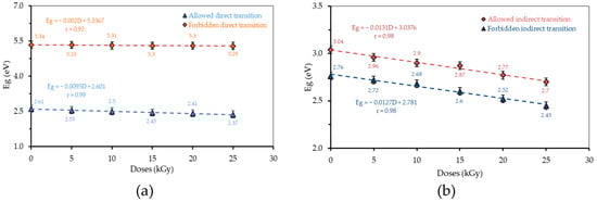 The relationship between the radiation dose and Eg for each transition of H3PO4 75 v%: (a) direct transition; and (b) indirect transition.