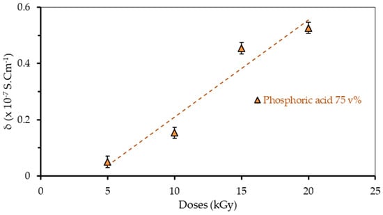 Figure 9 shows that the conductivity of the PVA–H3PO4 film increases with increasing radiation dosages. The concentration of H3PO4 also plays a role in determining the conductivity of the film. The conductivity of the film increases from 0.05 × 10−7 S cm−1 obtained using H3PO4 of 75 v% with an irradiation dosage of 5 kGy, and further increases at higher irradiation dosages. For irradiation dosages of 10, 15, and 20 kGy, the values of film conductivity at H3PO4 of 75 v% are 0.154 × 10−7 S cm−1, 0.454 × 10−7 S cm−1, and 0.526 × 10−7 S cm−1, respectively. Better results are obtained at H3PO4 85 v%, at an irradiation dosage of 5 kGy that results in electrical conductivity of 0.21 × 10−5 S cm−1. The increment of conductivity can be attributed to the doping of H3PO4 into the PVA thanks to the blending that forms the solution, leading to ionization as such the concentration of H+ from H3PO4 increased in the polymer blend. It implies that at higher H3PO4 concentrations, the concentration of H+ in the polymer blend also increases, which lifts the electrical conductivity.