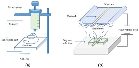 A strong electric field carries electric charges along the polymer surface, and Taylor cones are formed. Subsequently, the droplets of electrospinning solution are attracted to the counter electrode. As a result, the droplets are stretched extensively and form a very thin nanoscale fiber when they reach the substrate [87,88]. In the electrospinning process, a polymer solution or melt is generally deposited through a needle [89,90] or in needleless technique by coating a wire, cylinders, other objects that are used as electrodes or free surfaces with the polymer melt or solution [91,92,93]. The basic setup of electrospinning involves the application of a strong electric field to a droplet of the polymeric solution used (e.g., precursor melting solution). The typical setup of electrospinning essentially consists of a high-voltage field, a syringe pump, a spinneret, and a collector onto, which the nanofibers are deposited [94]. A basic setup of needle-based and needleless electrospinning principles is shown in Figure 1.