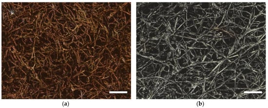 Confocal laser scanning microscopy (CLSM) images of oyster mushroom mycelium on polyacrylonitrile (PAN) nanofiber mats (the latter not visible) (a) after stabilization of the whole composite for 1 h at 280 °C; (b) after carbonization for 1 h at 500 °C of the whole composite. Scale bars indicate 20 µm. Reproduced from [19], published under a CC BY 4.0 license (MDPI, Basel, Switzerland).