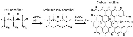 The dimensional change of the nanofiber mats takes place when the temperature is increased during the stabilization process. As the temperature increases, the dimensions of the samples will decrease. These changes happen on the molecular level due to the prevailing processes during the isothermal treatment. During the stabilization process in air, various processes, such as cyclization, dehydrogenation, oxidation, aromatization, and crosslinking reactions, take place, leading to an aromatic ladder structure [103,104]. These processes reduce the size of the sample area and the weight of the sample. The stabilization process plays an important role in the properties of the resulting CNFs and should be carried out in a controlled way. After stabilization, carbonization is performed, which is usually carried out in a nitrogen atmosphere and leads to different chemical and morphological properties of the carbon nanofiber depending on the treatment temperature. Figure 3 shows the changes at the molecular level and the transformation of PAN nanofiber mats into carbon nanofibers.