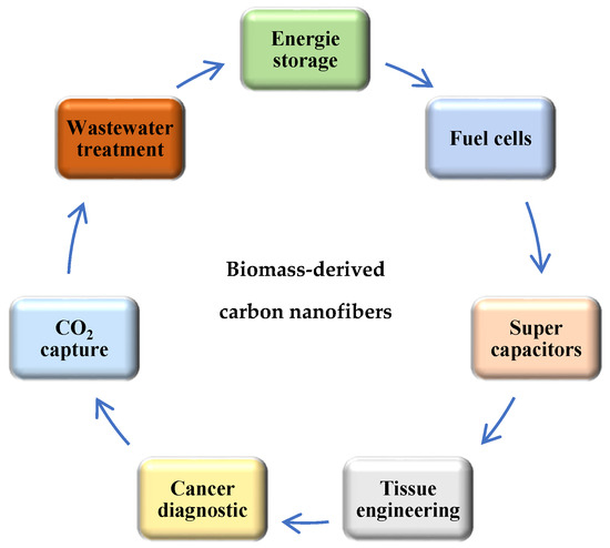 Electrospinning is one of the most productive methods for the preparation of carbon nanofiber using different precursor solutions. Recently, many authors have intensively studied the production of carbon nanofibers by electrospinning from biomass and polymers with or without additives, such as various metals, particles, acids, alkyls, to increase the importance of their application in industry. The importance of carbon nanofibers is based on their porous structure, high specific surface area, high conductivity, and thermal stability. All these properties make the development of the preparation methods a big challenger for recent works. Recently, the manufacturing of carbon nanofibers has significantly improved diverse applications due to their physical and chemical properties, such as high porosity and large specific surface area, numerous active sites, good catalytic properties, high conductivity, good temperature stability, and low-cost, which have been a challenge for many industrial applications (Figure 4), such as energy storage (fuel cells, electrochemical batteries and supercapacitors) [120,121,122], environment science [123,124], tissue engineering [125], optical sensors [126], cancer diagnosis [127].
