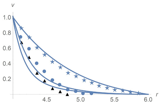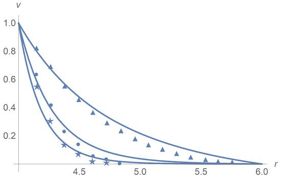 Calculated dimensionless velocity profiles versus the radial variable for . The lines from bottom upward correspond to , and , respectively. Triangles, balls and stars are the measured data from [9] corresponding to , and , respectively.
