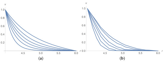 To study numerically the boundary-value problem (33)–(42) in the annulus , we pass to dimensionless variables: