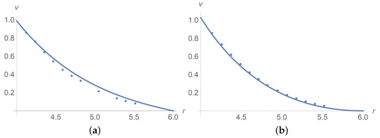 The solid line corresponds to a dimensionless velocity profile versus the radial variable for . Dots stand for experimental data [9]. (a) , (b) .