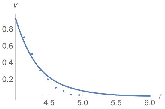 The solid line corresponds to dimensionless velocity profile versus the radial variable for and . Dots stand for experimental data [9].