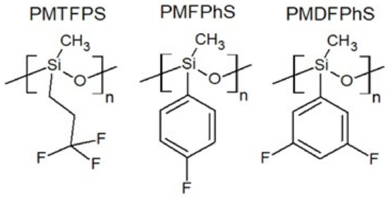 Polymethyl(3,3,3-trifluoropropyl)siloxane (PMTFPS) is an easily available and well-studied representative of fluorofunctional polysiloxanes. The presence of the fluorinated functional group has a significant impact on the properties of polysiloxane. It has a higher density of about 1.293 g/cm3 (21 °C) with an average molecular weight of 14,000 g/mol and a viscosity of about 13,000 mPa·s [20]. PDMS achieves a similar viscosity at an average molecular weight of 26,000 g/mol. The glass transition temperature of PMTFPS is −70 °C. The presence of trifluoropropyl groups also implies increased solubility in polar liquids. PMTFPS has interesting surface properties [21], which are compared to the properties of PDMS and fluorinated polyphenylmethylsiloxanes that are synthesized and characterized in paper [19] (Table 2). In paper [22], a synthesis method of fluorofunctional polysiloxane is proposed by means of the hydrosilylation of fluorinated allyl ethers. Structural formulas of fluorinated polysiloxanes are shown in Figure 2.