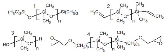 Polysiloxanes with different end groups: (1) trimethylsilyl, (2) vinyl, (3) hydroxyl, (4) epoxy.