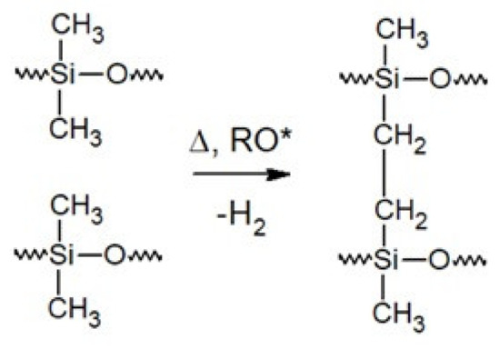 The selection of appropriate side groups or groups at the ends of the polysiloxane chain enables the silicone curing process to be carried out by a variety of reactions. In the literature, silicone rubbers are divided into HTV rubbers (high-temperature vulcanizable) and RTV rubbers (room-temperature vulcanizable). There are three main curing mechanisms in HTV silicones: curing with peroxides (Figure 5), high-temperature-activated hydrosilylation and reactions of vinyl groups with mercaptoalkyl groups [12].