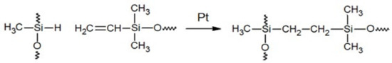 In the case of RTV silicones, there are usually single-component condensation-type silicones and two-component addition-type silicones [12]. In the first case, crosslinking occurs after contact of the silicone with moisture from the air as a result of the hydrolysis of alkoxy or acetoxy groups. In addition-type silicones, the mechanism is based on a hydrosilylation reaction catalyzed by platinum compounds (Figure 6).