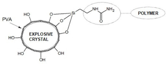 Alkoxy groups react with hydroxyl groups on the silica surface to form oxygen bridges (the by-product being alcohol), while the functionalized aliphatic group interacts with polysiloxane. Of course, on the surface of the explosive crystals, there are no hydroxyl groups capable of reacting with alkoxysilanes. The solution to this problem may be coating crystals with a layer of a substance with hydroxyl groups, e.g., poly(vinyl alcohol) (PVA, Figure 9).