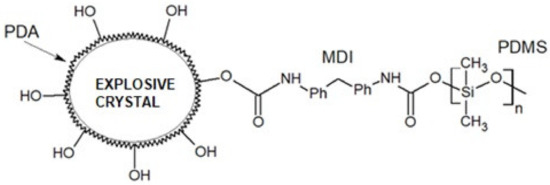 The authors of [47] conducted similar tests on the functionalization of explosive crystals’ surfaces using polydopamine (PDA). The functional groups derived from polydopamine were then used to make grafted copolymers with other polymers: poly(glycidyl azide) (GAP), poly(ethylene glycol) (PEG) and polytetramethylene ether glycol (PTMEG). The polymers mentioned could be replaced by, e.g., polydimethylsiloxane terminated with hydroxyl groups (Figure 10). Isocyanates such as 1,1′-methylenebis(4-isocyanatobenzene) (MDI), 2,4-diisocyanato-1-methylbenzene (TDI) and 1,6-diisocyanatohexane (HDI), which are commonly used in the production of polyurethanes [48], can act as a link between polymers.