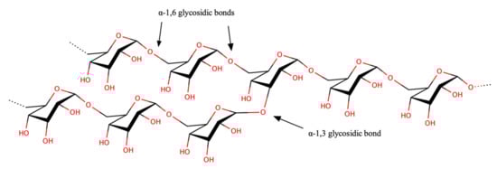 Consisting of α-d-glucopyranose subunits (Figure 1). Dextran is an exopolysaccharide with mostly α-1,6 glycosidic bonds (though smaller numbers of branching α-1,3, α-1,2 and α-1,4 bonds are present) [25,26]. Dextran utilization is widely recognized in food [27,28,29], cosmetic [26], and medicine [25]. Louis Pasteur first discovered dextran in 1861 from a viscous fermentation of wine [30], and later identified it via the chemical analysis of the product responsible for sucrose sugar syrup gelation [31]. The dextrorotatory nature of dextran inspired the nomenclature [32]. Several extensive dextran characterization studies carried out on dextran produced by Leuconostoc pseudomesenteroides XG5 [33], Leuconostoc mesenteroides AA1 [34], and Leuconostoc citreum B2 [35] confirmed its high-water retention capacity, which can allow it to act as a thickening agent, and potentially as a hydrocolloid and stabilizer agent [33].