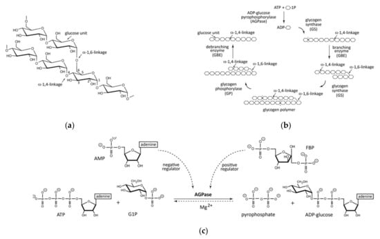 (a) The structure of glycogen, (b) biosynthetic pathway, and (c) regulatory pathway for glycogen accumulation in bacterial systems. Used with permission from Cifuente et al. [68]. © 2021 The Author(s). Published by Elsevier B.V.