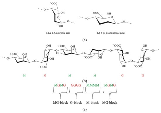Structure of alginate (a) monomer, (b) chain conformation, and (c) distribution [120].