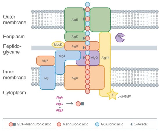Schematic representation of biosynthesis of alginate in P. aeruginosa. Modified with permission from Schmid et al. [121].