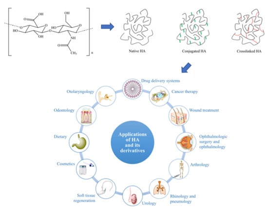The popular modifications and potential biomedical applications of hyaluronic acid. Used with permission from Fallacara et al. [142]. Copyright © 2021 by the authors. Licensee MDPI, Basel, Switzerland.