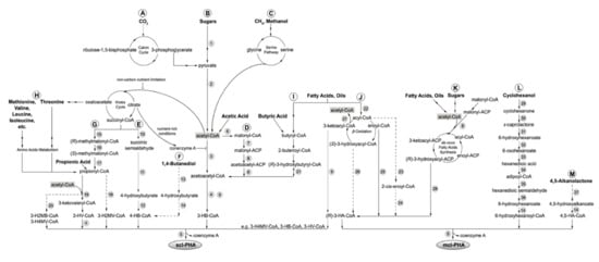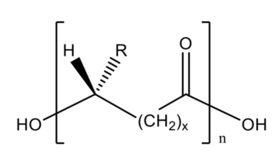Polyhydroxyalkanoates or PHAs were discovered by French microbiologist Maurice Lemoigne in 1926. He extracted the biopolymer within a bacterium called Bacillus megaterium that contained a short-chain-length PHA, poly(3-hydroxybutyrate) or P(3HB) [248]. PHA is a polyester, a polymer with linear ester linkages and differs in terms of the side pendant chain. The side chain is typically a saturated aliphatic chain with a range of carbon count of up to 13 carbons [249]. There were also variations in terms of the position of the pendant chain, such as 4-, 5-, and 6-hydroxyalkanoates, resulting in different polymer characteristics (Figure 11 and Table 2). These different polymer molecular structures are derived from different bacterial strains and species, as well as different carbon sources used, including fatty acids and sugar (Figure 12) [250].