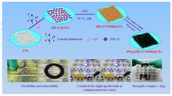 Fabrication process of PPy@ZIF-67 derived cobalt oxyhydroxide@CFs (PZCC) hybrid electrode materials and photographic images (flexibility, tailorability, conductivity, and strength).