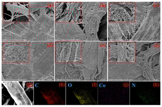 The morphology of CFs, PC, ZCC-1, ZCC-2, PZCC-1, and PZCC-2 at low and high magnifications (insert images) are shown in Figure 2. The surface of pure CFs is smooth, with no other substance in Figure 2a. The morphology of PC composite is displayed in Figure 2b, where the PPy presents a spherical shape with a diameter of tens of nanometers. Figure 2c,d shows the rough surface of CFs at low magnification, indicating the successful coating of cobalt oxyhydroxide, and it can be seen clearly that some particles are tightly packed and distributed on the surface of CFs at high magnification. The SEM results showed that the successful preparation of cobalt oxyhydroxide particles with regular nanoscale via ZIF-67 as precursor. Compared to PPy@CFs composites, the microscopic morphology of PZCC hybrid electrode material is different, as shown in Figure 2e,f, which is mainly reflected in the change from spherical to short rod morphology. This is more conducive to the charge transfer in the electrochemical process. The elemental mapping of PZCC-2 hybrid electrode material provides more evidence for homogeneous distribution of Co and N elements, i.e., cobalt oxyhydroxide and PPy, as shown in Figure 2g–k.