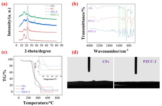 (a) XRD patterns of CFs, PC, ZCC-2, and PZCC-2. (b) FTIR spectra of CFs, ZCC-2, and PZCC-2. (c) TG curves of CFs, PC, and PZCC-2. (d) Hydrophilicity of CFs and PZCC-2.