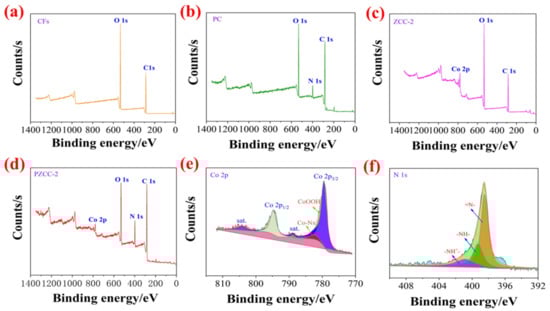 XPS survey spectrum of CFs (a), PC (b), ZCC-2 (c), and PZCC-2 (d). High-resolution XPS of Co 2p (e) and N 1s (f) based on ZCC-2 and PZCC-2.