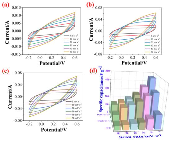 CV profiles of PC (a), PZCC-1 (b), and PZCC-2 (c) electrodes recorded using different scan rates of 5, 10, 20, 30, 40, and 50 mV·s−1, and (d) specific capacitance of PC, PZCC-1, and PZCC-2 at different densities of 5, 10, 20, 30, 40, and 50 mV·s−1.
