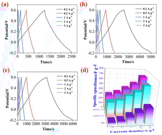 GCD profiles of PC (a), PZCC-1 (b), and PZCC-2 (c) electrodes at different current densities of 0.2, 0.5, 1, 2, and 3 A·g−1. (d) Comparative profiles of specific capacitance for PC, PZCC-1, and PZCC-2.