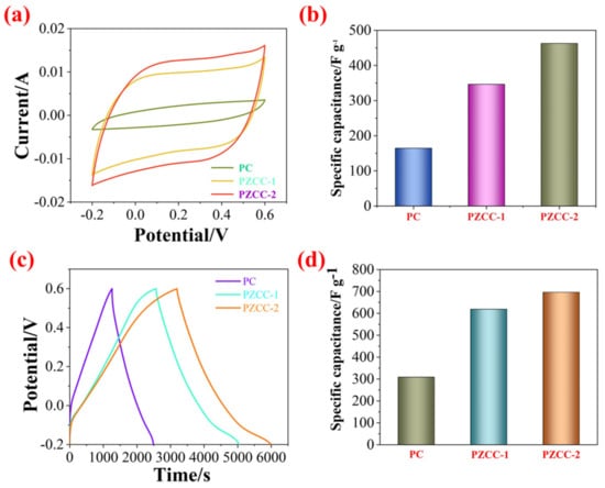 (a) Comparative CV profiles of PC, PZCC-1, and PZCC-2 at a scan rate of 5 mV·s−1, (b) specific capacitance of PC, PZCC-1, and PZCC-2 at a current density of 5 mV−1, (c) comparative GCD profiles of PC, PZCC-1, and PZCC-2 at a current density of 0.2 A·g−1, and (d) specific capacitance of PC, PZCC-1, and PZCC-2 at a current density of 0.2 A·g−1.