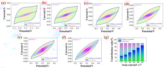 Diffusion controlled and capacitance CV profiles for PZCC-2 electrodes at different scan rates of 5, 10, 20, 30, 40, and 50 mV·s−1 (a–f), and (g) contribution ratio of diffusion controlled and capacitance for PZCC-2 electrode material at different scan rates of 5, 10, 20, 30, 40, and 50 mV·s−1.