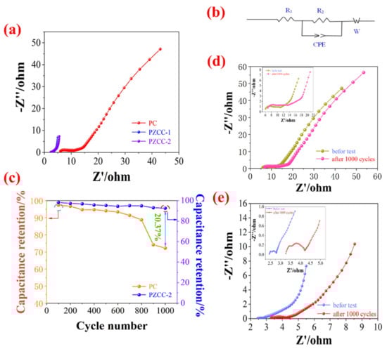 (a) Comparative Nyquist plots of PC, PZCC-1, and PZCC-2 electrode materials, (b) EIS circuit of electrode materials, (c) capacitance retention of PC and PZCC-2 electrode materials, and (d,e) Nyquist plots of PC and PZCC-2 electrode materials before and after 1000 cycles.