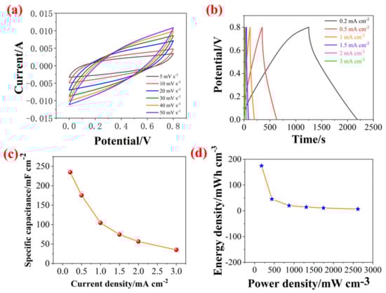 To investigate the electrochemical performance of PZCC-2-SCs, the CV and GCD were performed at various scan rates and current densities over the potential window of 0–0.8 V, and the corresponding results are shown in Figure 10. The specific capacitance is 234.50, 175.19, 104.25, 74.49, 56.30, and 35.03 mF·cm−2. Then, the volumetric energy density (E) and power density were calculated according to the equations of (4) and (5). The PZCC-2-SCs can provide an energy density of 45.51 mWh cm−3 at a power density of 174.67 mW cm−3, which is higher than previous report [53,54], suggesting the potential application in energy storage area.