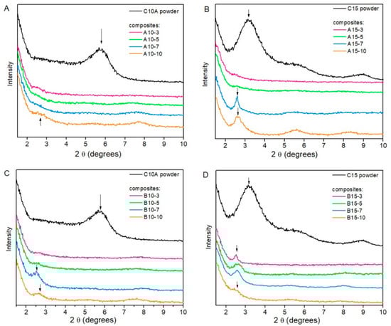X-ray diffraction patterns of (A) Cloisite® 10A powder (C10A) and rubber nanocomposites with C10A. (B) Rubber nanocomposites with CB and C10A. (C). Cloisite® 15 powder (C15) and rubber nanocomposites with C15. (D). Rubber nanocomposites with CB and C15.