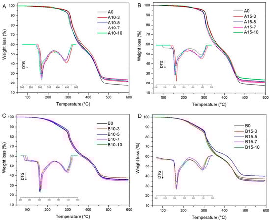 The rubber nanocomposites’ thermal stability and degradation temperature can be evaluated by thermogravimetric analysis (TGA) (Figure 2). All rubber nanocomposites exhibited similar thermal behavior regarding mass loss, with two decomposition steps displayed. The first step, between 50 and 300 °C with a weight loss of about 20.0%, was associated with low molecular weight substance losses. In this step, the degradation corresponds to the decomposition of volatiles and CR rubber, mainly due to dehydrochlorination. The rapid thermal degradation was explained by autocatalytic chloroprene chain pyrolysis, with the formation of HCl and chloroprene monomer, which was previously reported by Das et al. (2008) [36]. In the A0 composite, the degradation started at around 230 °C and reached a maximum rate at around 311 °C. It was observed that nanocomposites without CB and with a 7 and 10 phr filler concentration of organoclay C10A and C15 caused a decrease around 5 and 7 °C in the first decomposition step, respectively, while in the compounds with carbon black it was 2 and 3 °C. The octadecylamine hydrochloride ions weakly bound to the surface of the montmorillonite, that is, ions adsorbed on the hydroxyl groups at the edges of the clay sheets [30,31]. It is speculated that a higher concentration of filler generated a decrease in the dispersion and distribution of these inside the rubber matrix, producing agglomerates that facilitated the transfer of volatiles, thereby hastening matrix degradation, which in turn caused a decrease in the thermal stability of the composites [38].