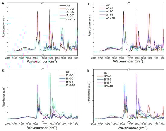 FT-IR spectra of rubber nanocomposites containing different types and amounts of fillers. (A) Cloisite® 10A. (B) Cloisite® 15. (C,D) Cloisite® 10A and Cloisite® 15 plus carbon black N330, respectively.