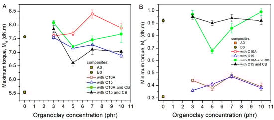 In the case of the maximum torque (MH) of the CR/NR/BR matrix, it was increased at 3 phr in C10A and C15 by 37% and 36%. However, at higher concentrations than 3 phr, the increase in MH was not significant (see Figure 4A). It was evidenced that organoclays did not cause the inactivation of curing agent additives [36], and that the crosslinking of the cured composites was favored at low concentrations of the organoclay. While in composites with carbon black, the MH increased by 36% in contrast to the A0 composite, which was even lower than that achieved by the organoclays. This result was consistent with modulus at 300% and the tensile strength of the CR/NR/BR matrix, in which organoclay could improve these properties at low concentrations (5 or 7 phr), even without carbon black.