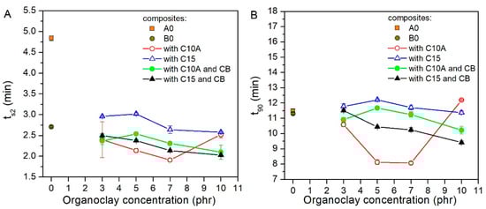 Curing times of rubber nanocomposites. (A) Vulcanization start time (ts2). (B) Time at 90% for vulcanization degree (t90).