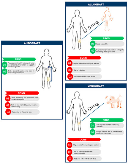 New promising solutions for bone tissue engineering have been developed over the last years following the dramatic increase of the number of bone-related medical conditions that require clinical interventions. In fact, each year, more than one million non-union fractures are treated in the United States [1]. Moreover, 5–10% of the bone fractures that occur worldwide do not heal [1]. Besides bone fractures, bone tissue can also be damaged by traumas, tumors, infections, or bone diseases. Furthermore, new strategies to engineer bone tissue are required as an alternative to the use of bone grafts, addressing the increasing worldwide incidence of bone disorders in an aging society severely impacted by obesity, lack of exercise, and with reducing healing capacity [2]. Even though bone tissue engineering appears as a promising alternative, to date the gold-standard treatment for bone regeneration still relies on bone grafts, autologous, allogenic, and xenogeneic grafts [1] (Figure 1). These approaches have some limitations and are not ideal for bone regeneration. Autografts have been applied since they can provide a matrix with osteogenic cells and osteoinductive factors to support new bone growth, without having immunological rejection and promote better osseointegration. Nonetheless, the availability of quality graft material is limited and possible complications may occur, such as pain, infections, scarring, and weakening of the donor bone. Moreover, there is a high morbidity associated with this procedure, since more than one surgery is needed [1,3]. Allografts, usually harvested from cadavers, have also some limitations, namely the higher risk of immunologic rejection and infection though it requires less procedures than autografts, minimizing the surgical time and accelerating the patient recovery [3]. As an alternative to allografts, xenografts consist of transplantation of bone tissue across species. The most common xenograft used in orthopedic surgery is bovine derived. Xenografts have some advantages compared to other grafts, such as being readily available due to the abundance of donor bone tissue and being less expensive than allografts [2,3]. In fact, commercially-available xenografts are approximately one-tenth the price of commercially-available allografts. Also, because of the extensive sterilization processes, their shelf life is generally long. However, xenografts present several challenges such as the risk of disease transmission and a higher risk of immune response of the host tissue compared to allografts [3]. Moreover, xenografts require intensive sterile processing, which can decrease their osteoinductive properties.
