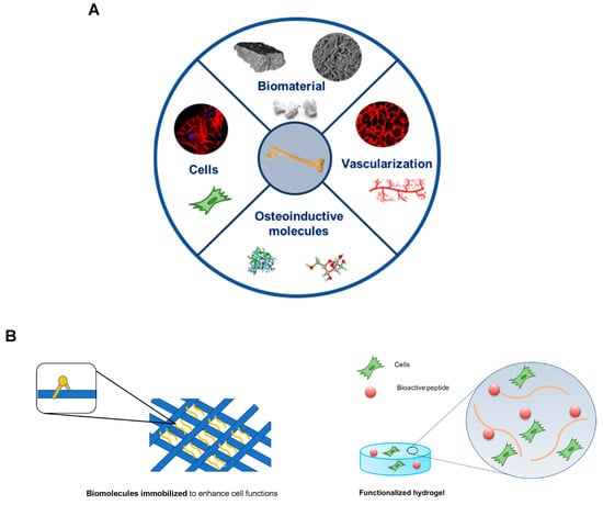 Bone tissue engineering strategies. (A) The bone tissue engineering paradigm highlights (1) Biomimetic scaffold, (2) osteogenic cells, (3) osteoinductive molecules, and (4) vascularization. (B) Schematic representation of biomolecules immobilized into a porous scaffold (left) and a functionalized hydrogel with bioactive peptides and cells incorporated (right).