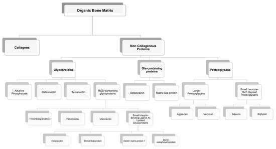 In bone, non-collagenous proteins are mainly composed of two major types: Glycoproteins and gamma-carboxyglutamic acid (Gla)-containing proteins; however some proteoglycans can also be found in smaller content [31,32]. The most relevant and abundant glycoproteins are represented by alkaline phosphatase (ALP), ON, and the Arginine-Glycine-Aspartic acid (RGD)-containing proteins, which include, but are not limited to, OPN and sialoproteins. Of the Gla-containing proteins, OC is the major component.