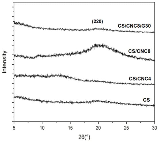 The XRD patterns of the chitosan film (CS) and its bio-composite films consisting of either 4 (CS/CNC4) or 8 wt% CNC (CS/CNC8), and 8 wt%CNC/30 wt% glycerol (CS/CNC8/G30) are shown in Figure 1. A broad peak at around 2θ = 20° was observed in the diffractogram of the chitosan corresponding to the crystal plane of (220) of the crystalline structure [8]. A peak at around 2θ = 13° was exhibited in the diffractogram of the chitosan bio-composite consisting of 4 wt% CNC, indicating a hydrated crystalline structure [16,21]. Furthermore, the addition of 8 wt% CNC led to increased peak intensity at 2θ = 20°. This increase in peak intensity might be attributable to the transcrystallization effect [8]. The transcrystallization impact corresponds to the crystal orientation of the semicrystalline matrix perpendicular to the cellulose nanocrystalline [22]. Crystallization of the polymer matrix is enhanced by nanocrystalline cellulose, resulting in a transcrystalline layer around the CNC [23]. The effect of addition of 30 wt% glycerol on the chitosan/CNC bio-composite film structure is also shown in Figure 1. The presence of 30 wt% glycerol led to a drastic decrease in the intensity of the peak at 2θ = 20°. This suggests that the introduction of 30 wt% glycerol reduced the crystalline structure of the film. In other words, adding glycerol lowered the crystallinity of the film, influencing the mechanical properties of the films. Glycerol is a polyalcohol and is the most used cryosolvent because of its antifreeze properties. Glycerol might act as an antinucleation agent in the crystallization process, resulting in lower crystallinity of the film [24].
