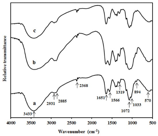 Fourier transform infrared (FT-IR) spectra of (a) chitosan, (b) bio-composite film with 4 wt% cellulose nanocrystal (CNC), and (c) bio-composite film with 4 wt% CNC and 20 wt% glycerol.