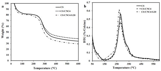 Figure 3a depicts the TGA curves of the chitosan (CS) and its bio-composite films consisting of 4 wt% CNC (CS/CNC4) and 20 wt% glycerol (CS/CNC4/G20). All the films exhibited similar behavior, with three main thermal degradation steps at temperature ranging from 27 to 600 °C. The first step (50–100 °C) is ascribed to the elimination of water molecules from films. Moreover, the weight loss may be related to the dehydration of loosely bound water and evaporation of low molecular weight compounds in the films [11]. The second stage occurred over a range of temperatures from 140 to 395 °C. In this stage, the weight loss is probably associated with the decomposition of glycerol, CNC, and chitosan. The main processes involved in CNC decomposition at the temperature range of 240–335 °C are cleavage of cellulose glycosidic bonds, rearrangement, dehydration, and breakdown reactions with C=O, water, and low-volatility molecular compounds [18,30]. Major decomposition of chitosan took place at approximately 140–310 °C through the depolymerization of the chitosan chains, including the deacetylation and cleavage of glycosidic linkages through dehydration and delamination [18,30]. The third step occurred in the temperature range of 395–600 °C. This is associated with the oxidation and breakdown of char into gas products of lower molecular weight [9].