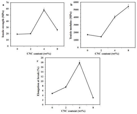 (a) Tensile strength of the chitosan/cellulose nanocrystal (CNC) bio-composite films with varying CNC contents, (b) tensile modulus, and (c) elongation at break.