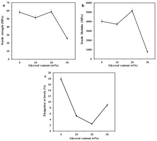 Figure 5 displays the tensile properties of the bio-composite film with 4 wt% CNC as a function of glycerol content. The tensile strength of the bio-composite films with 10, 20, and 30 wt% glycerol was found to be 52, 59, and 26 MPa, respectively (Figure 5a). This indicates that the tensile strength of the film declined slightly with the presence of 10 wt% glycerol while increased slightly at 20 wt% and then decreased drastically at 30 wt% glycerol. A slight increase in tensile strength at 20 wt% glycerol might be associated with a better dispersion of CNC in the polymer matrix. At 30 wt%, a drastic decrement in tensile strength was associated with more dominant plasticizing effect of glycerol. Moreover, as a plasticizer, glycerol is a small oligomer that can penetrate macromolecules, which increases the free volume available between polymer chains, leading to a reduction in the physical entanglements and finally resulting in decreased tensile strength [17].