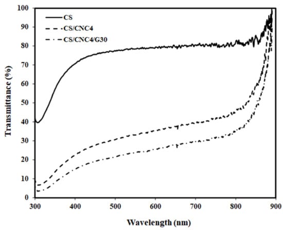 The light transmittance of the chitosan film (CS) and its bio-composites with 4 wt% CNC (CS/CNC4) and with 30 wt% glycerol (CS/CNC4/G30) is presented in Figure 7. At all analyzed wavelength ranges, both bio-composite films consisting of 4 wt% CNC and 30 wt% glycerol exhibited much lower light transmittance than the chitosan. The light transmittance decreased in the following order: CS > CS/CNC4 > CS/CNC4/G30. This indicates that adding CNC drastically decreased the light transmittance of the chitosan. This suggests that the transparency of the chitosan decreased remarkably due to the presence of CNC. This is attributed to the light path’s blockage through the polymer matrix resulting from the strong interface interaction between the CNC and the chitosan matrix [40,45]. Moreover, this decrease in transparency was also due to the increase in light scattering by the cellulose nanocrystals [46,47]. According to Tibolla et al. [45], a decrease in the light transmission of composite films can be influenced by the size and dispersion of nanofillers in the polymer matrix [42]. The decreased transmittance of the bio-composite films because of the presence of CNC was also reported by previous researchers using different biopolymer matrices such as agar [5], chitosan [18], and alginate [48]. The decreased light transmittance of the chitosan film resulting from the presence of nanoclay was also demonstrated in a previous study [33]. Furthermore, the chitosan/CNC bio-composite films plasticized with 30 wt% glycerol exhibited lower light transmittance than unplasticized films. This suggests that adding glycerol decreased the transparency of the chitosan/CNC bio-composite films. This is probably associated with the existence of a suitable contact area between the chitosan matrix, CNC, and glycerol [40]. Moreover, the film’s light transmittance was strongly influenced by the film thickness, in which a film with a higher thickness had a lower light transmittance [49]. The thickness of the chitosan was thinner compared to that of the bio-composite films. A decrease in the transparency of the bio-composite films containing glycerol has also been observed in previous studies [38,50].