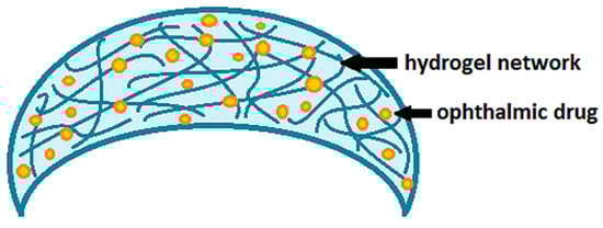 Contact lenses loaded with drugs are certainly among the most innovative delivery systems proposed to improve corneal permeation and the bioavailability of ophthalmic drugs. Nowadays, conventional hydrogel-based soft contact lenses are the most proposed ones for therapeutic purposes [15,16,17], as also widely demonstrated by the studies reported in Table 1. Hydrogels are generally defined as polymer networks extensively swollen with water [18]. Due to the high porosity and surface area, hydrogels have the ability to incorporate active principles within their own network (Figure 2). Once the therapeutic hydrogel contact lenses are worn, the embedded drug is released to the post-lens tear fluid, thus, reaching the target tissue.